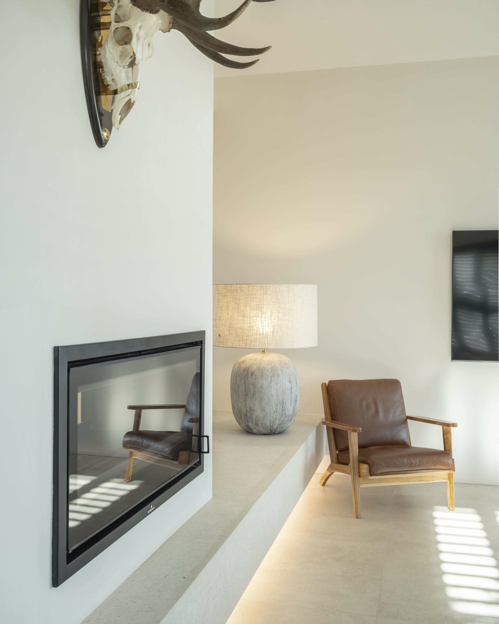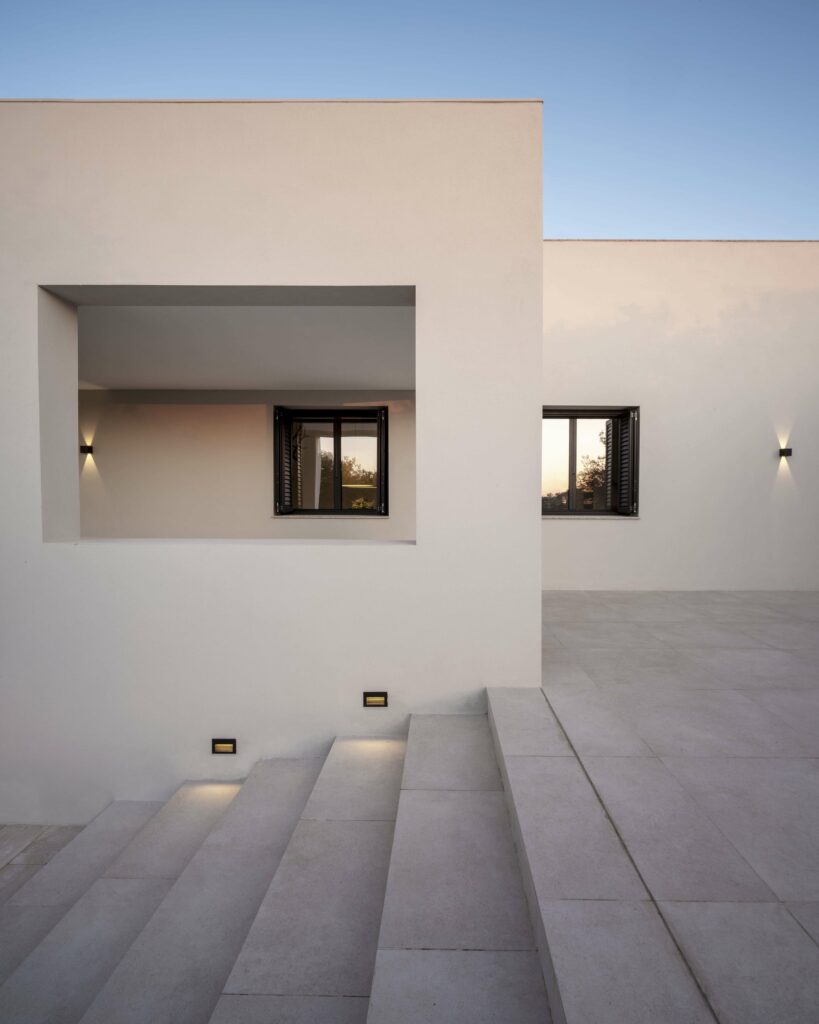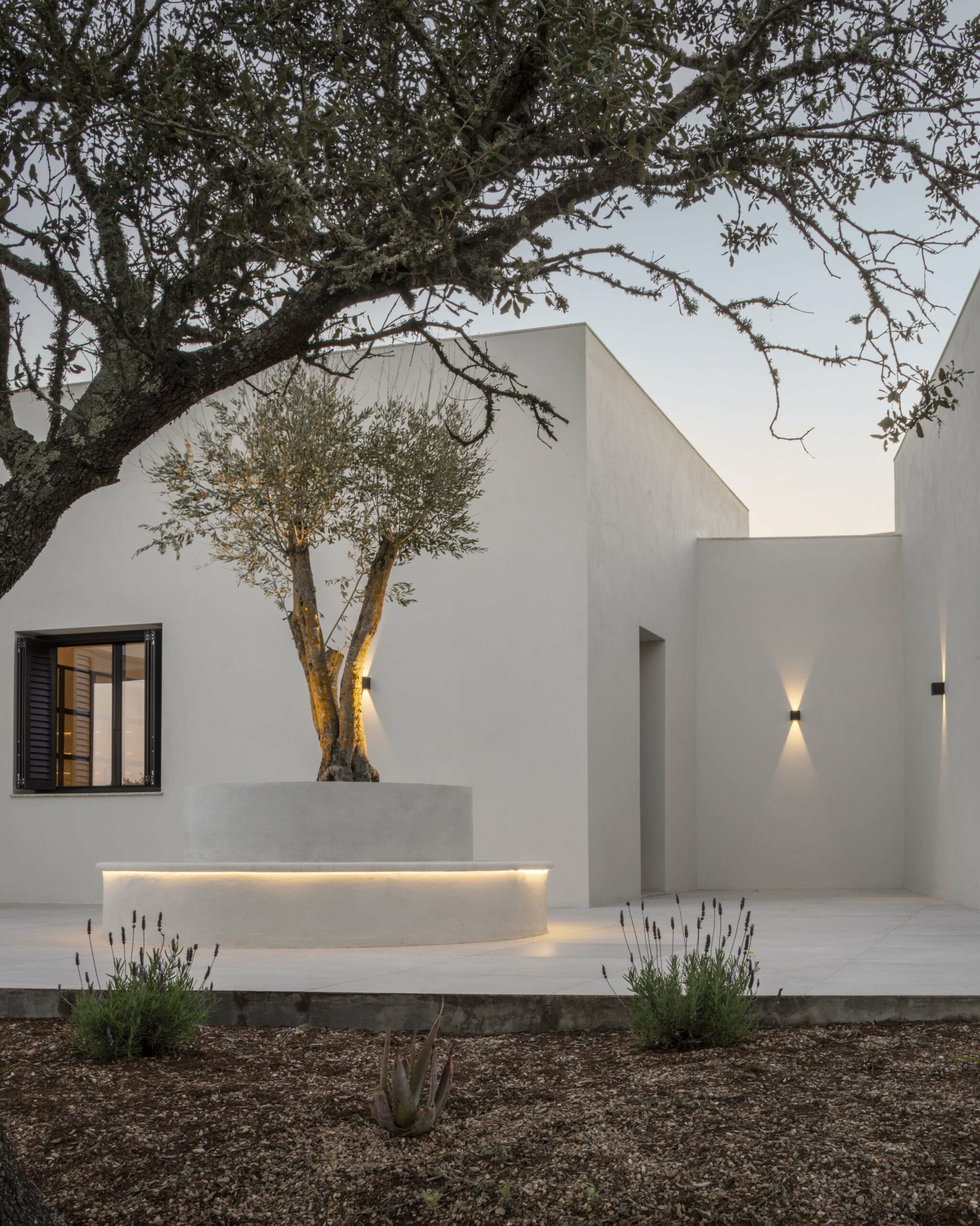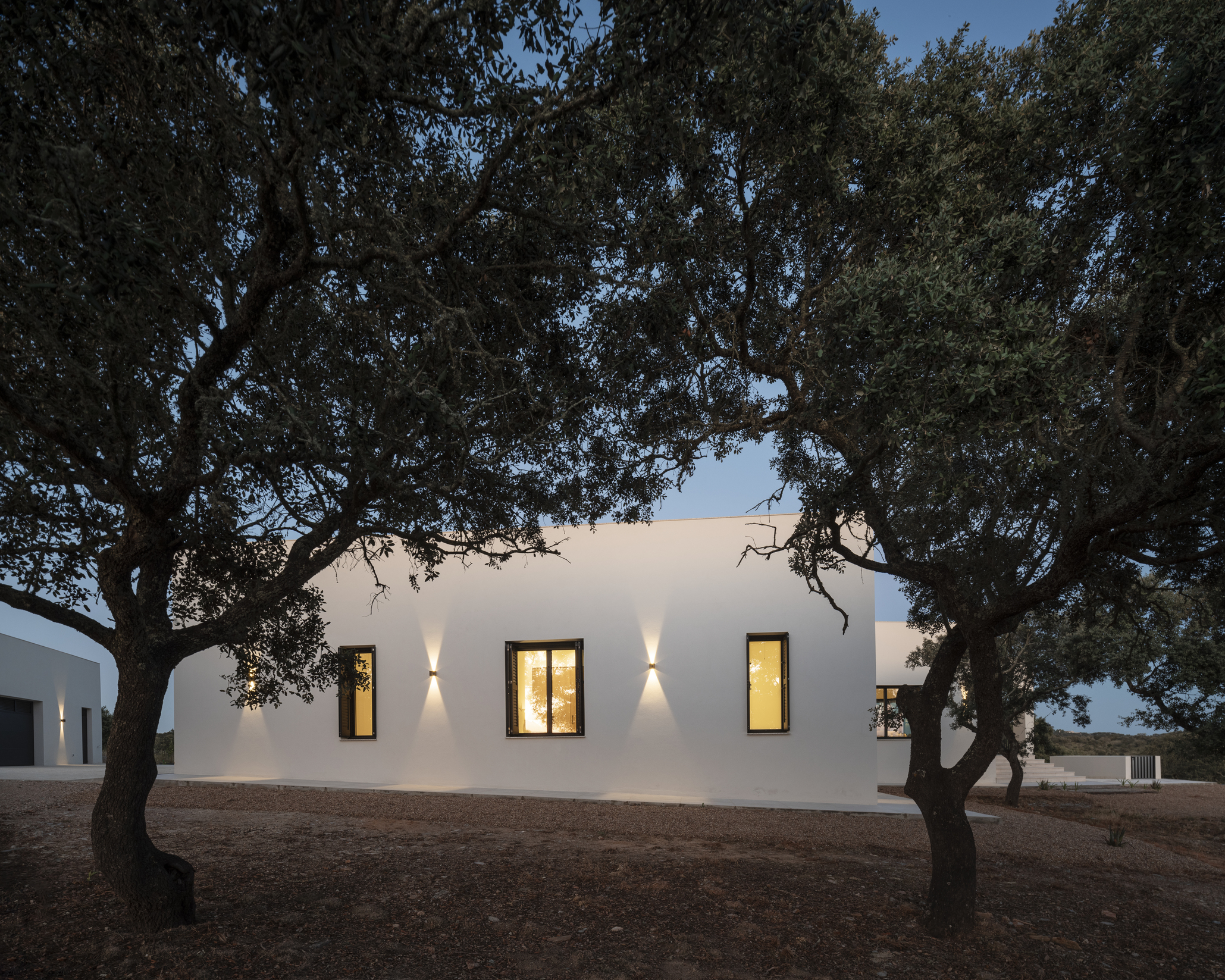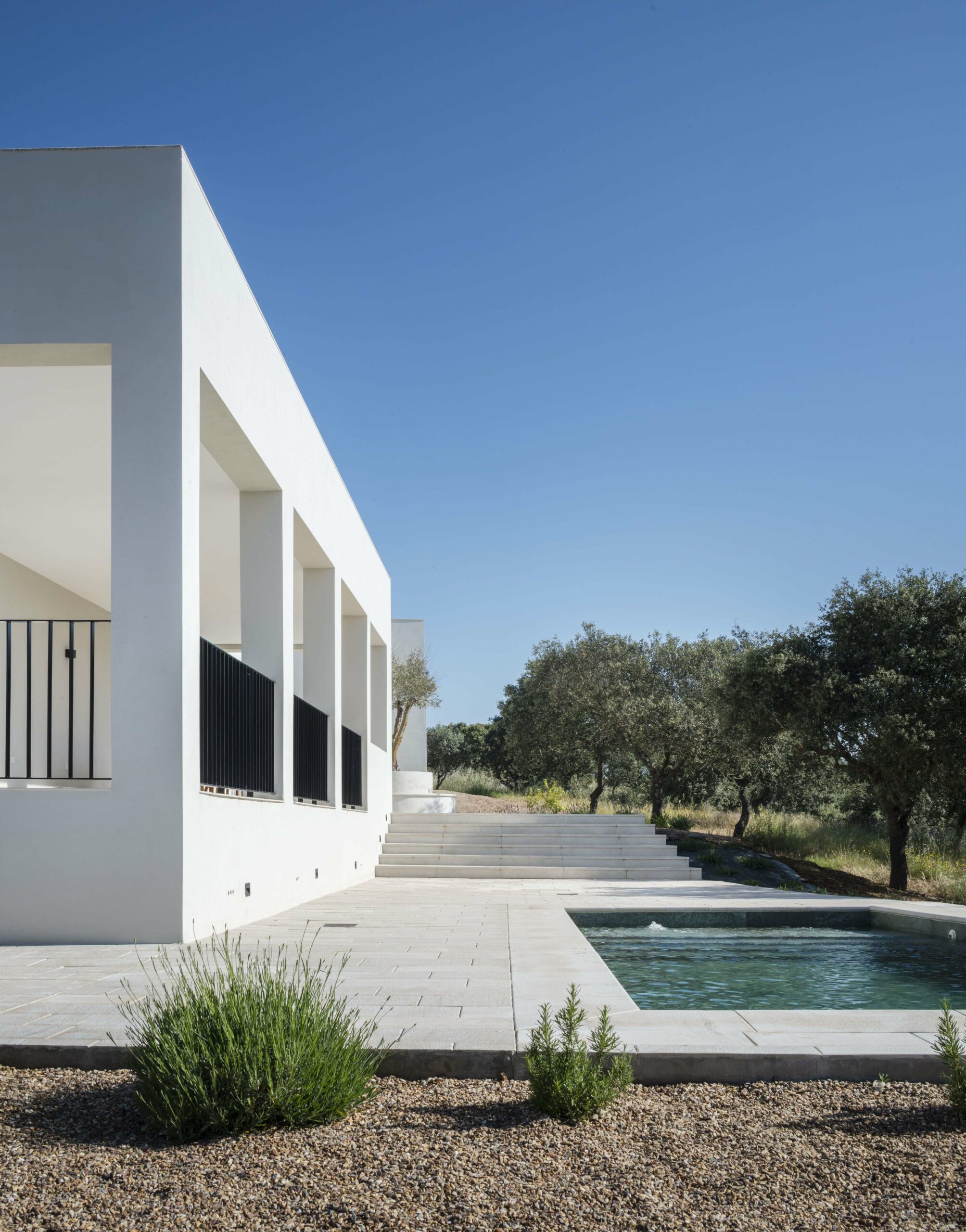 En cuanto al material del pavimento exterior, se ha optado por un color similar al de la fachada para crear una homogeneidad en la construcción y potenciar así, sin quitar protagonismo, al verde de la vegetación de encinas del entorno. Incluso en el vaso de la piscina, se ha elegido el mismo tipo de pavimento.