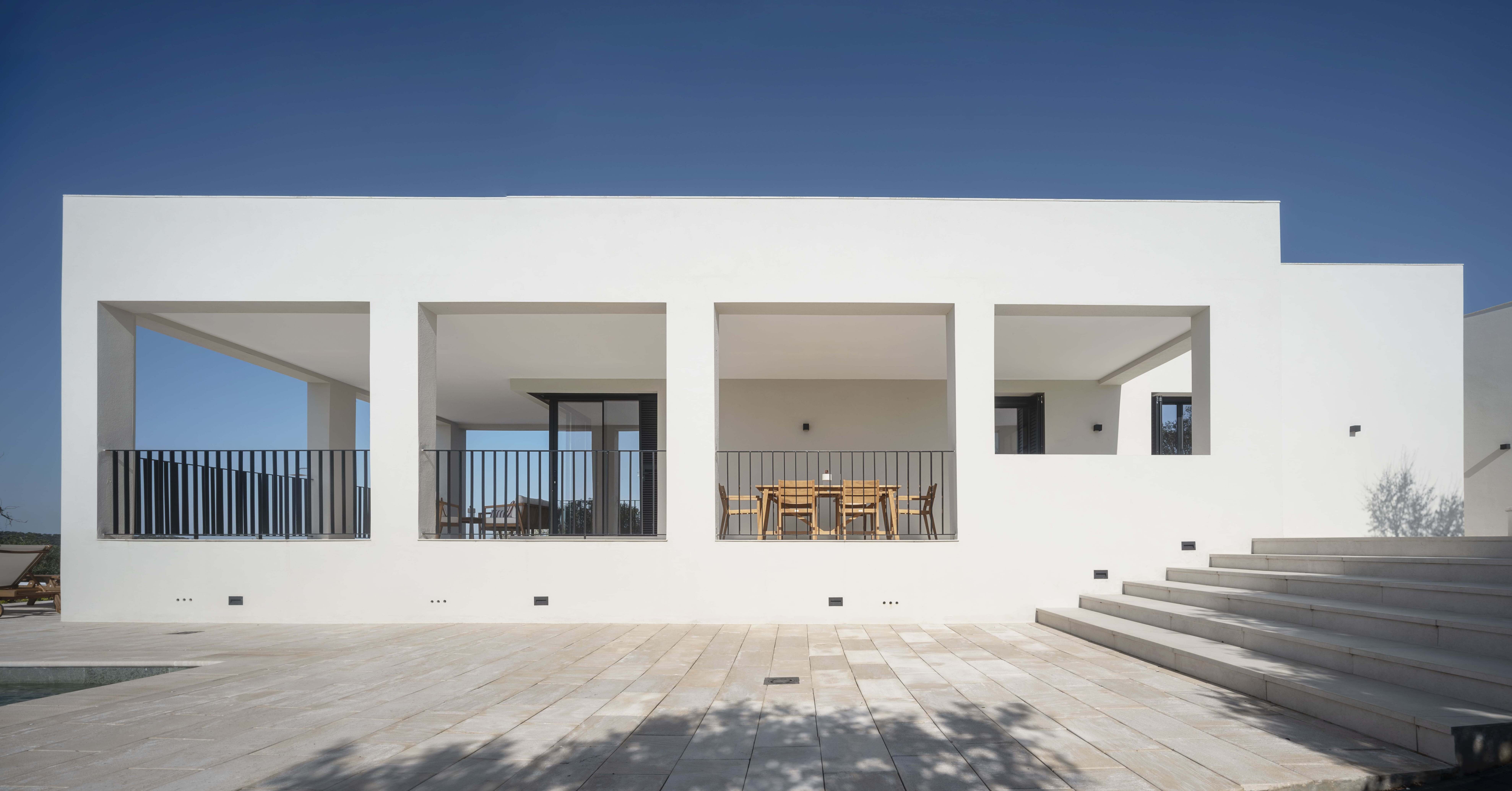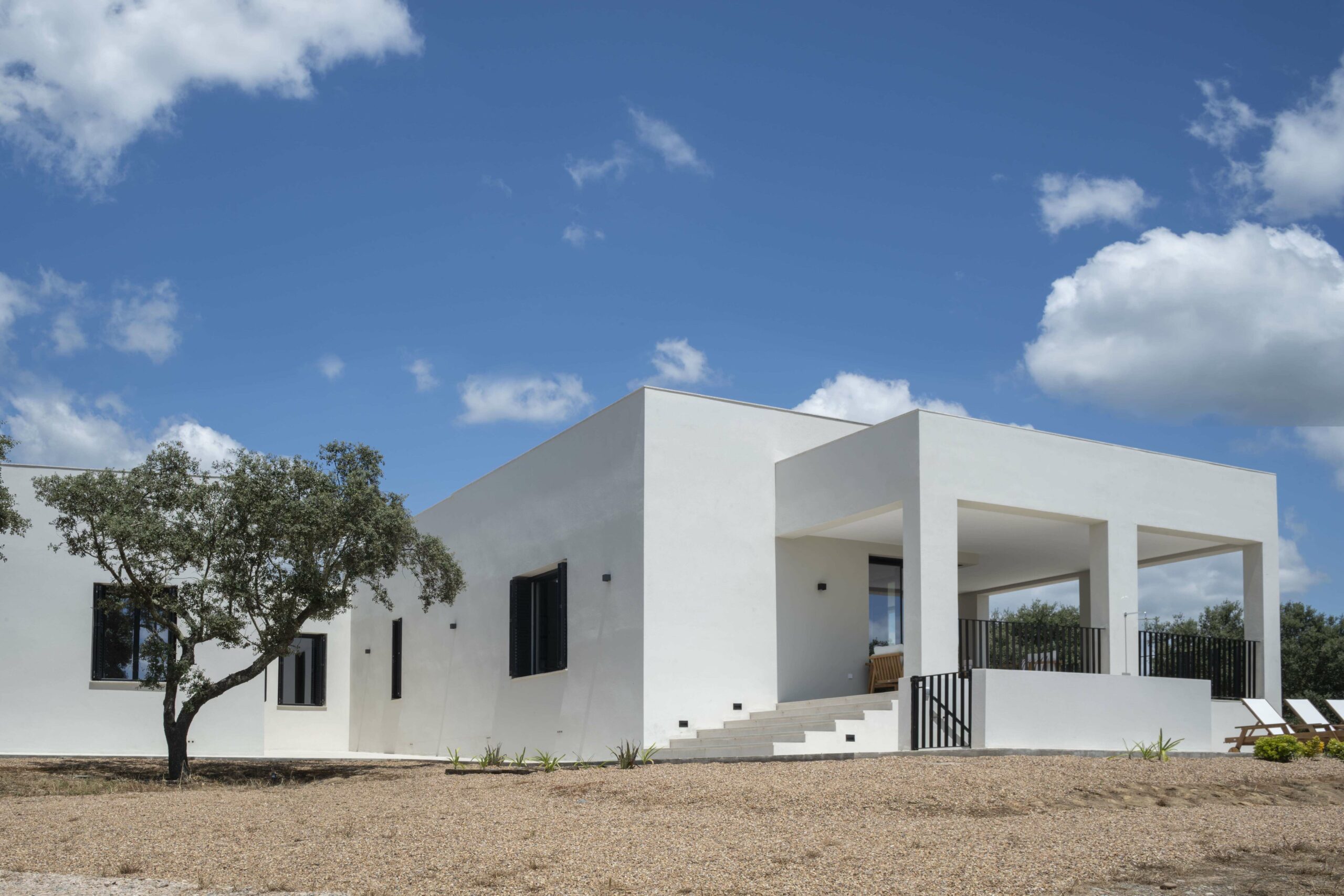 Para la fachada, se ha elegido mortero monocapa con pigmento de color neutro, con la finalidad de facilitar el mantenimiento a largo plazo. Para las carpinterías tanto de ventanas, contraventanas y barandillas, se ha optado por el color negro para darle una identidad más moderna al clásico cortijo típico de la zona.