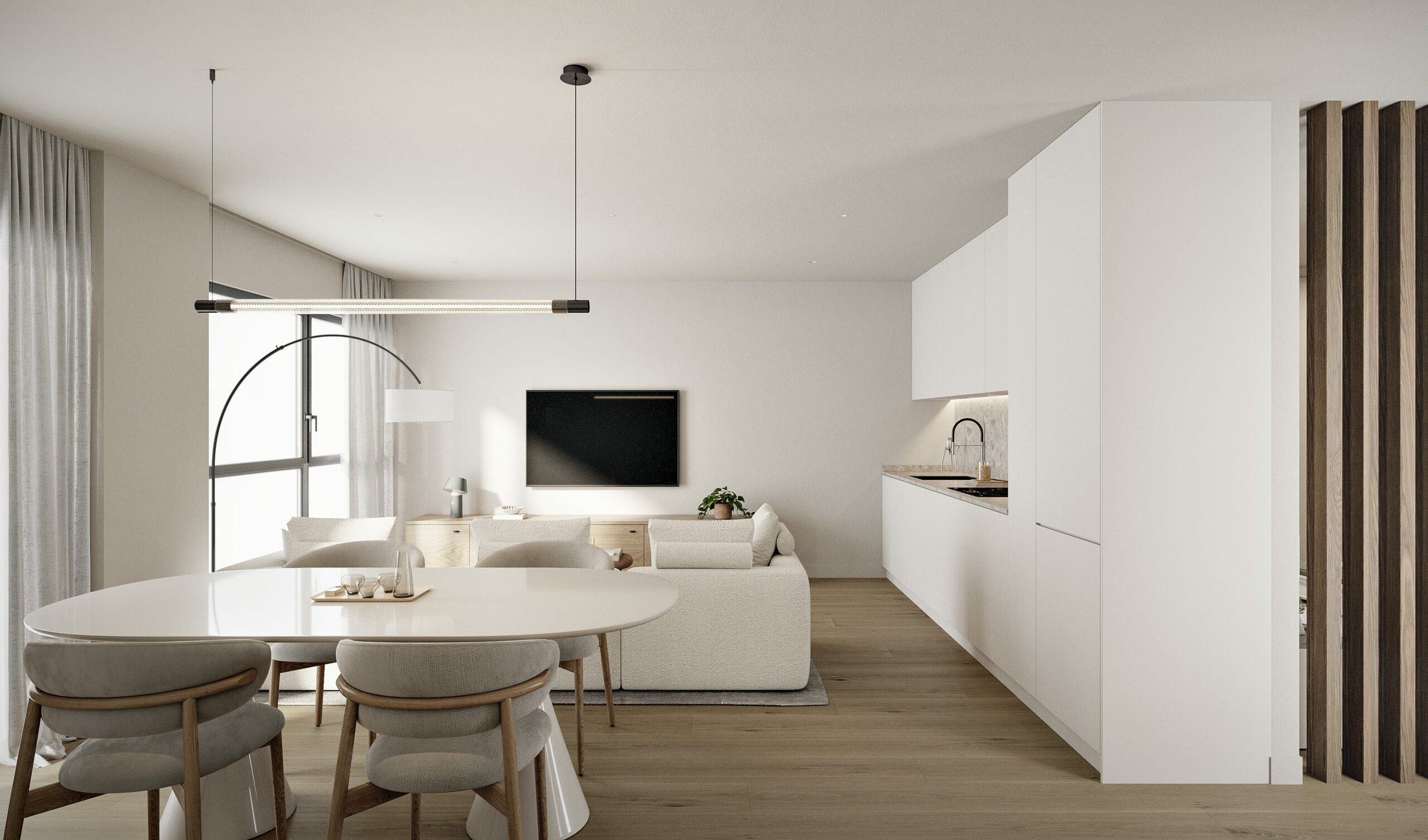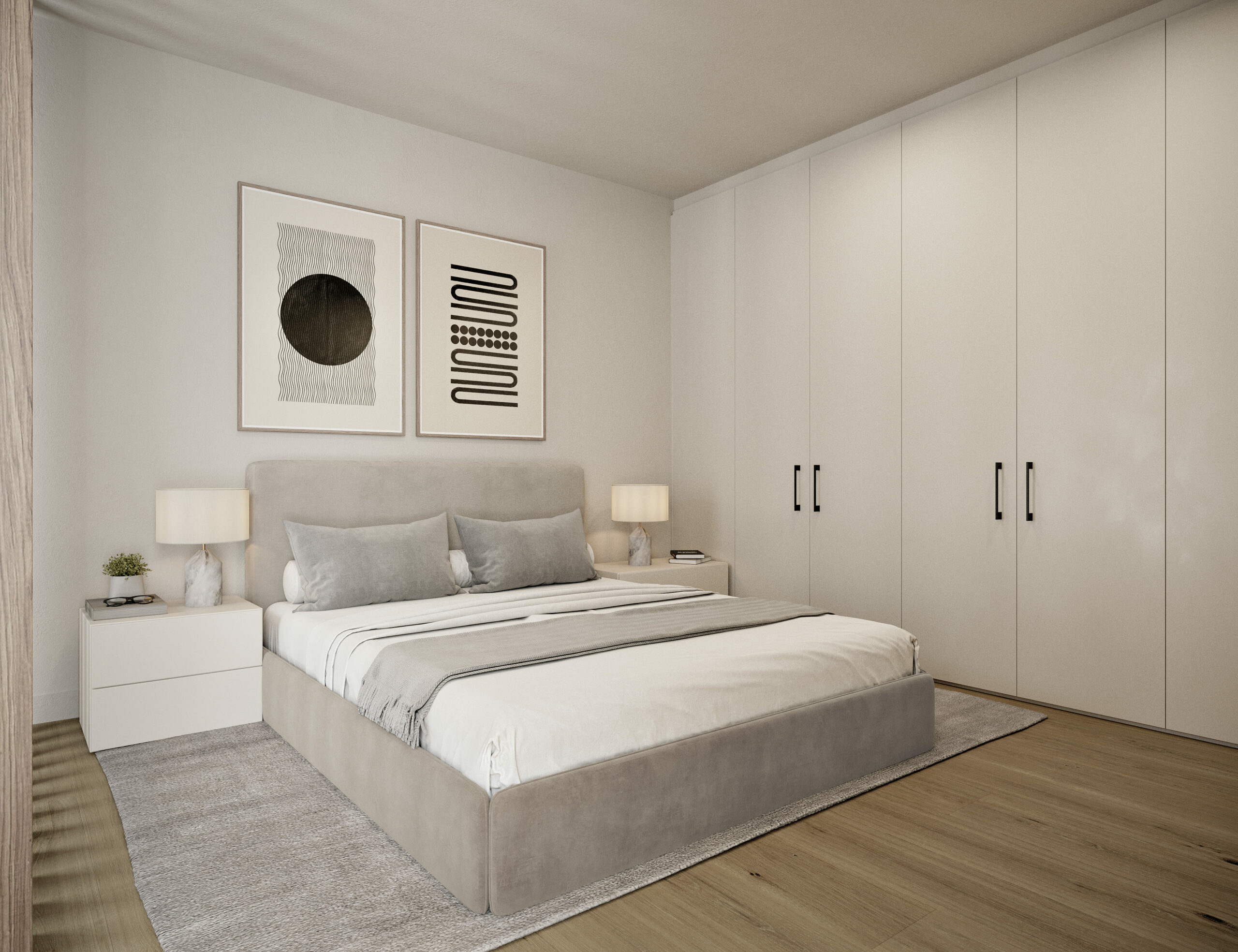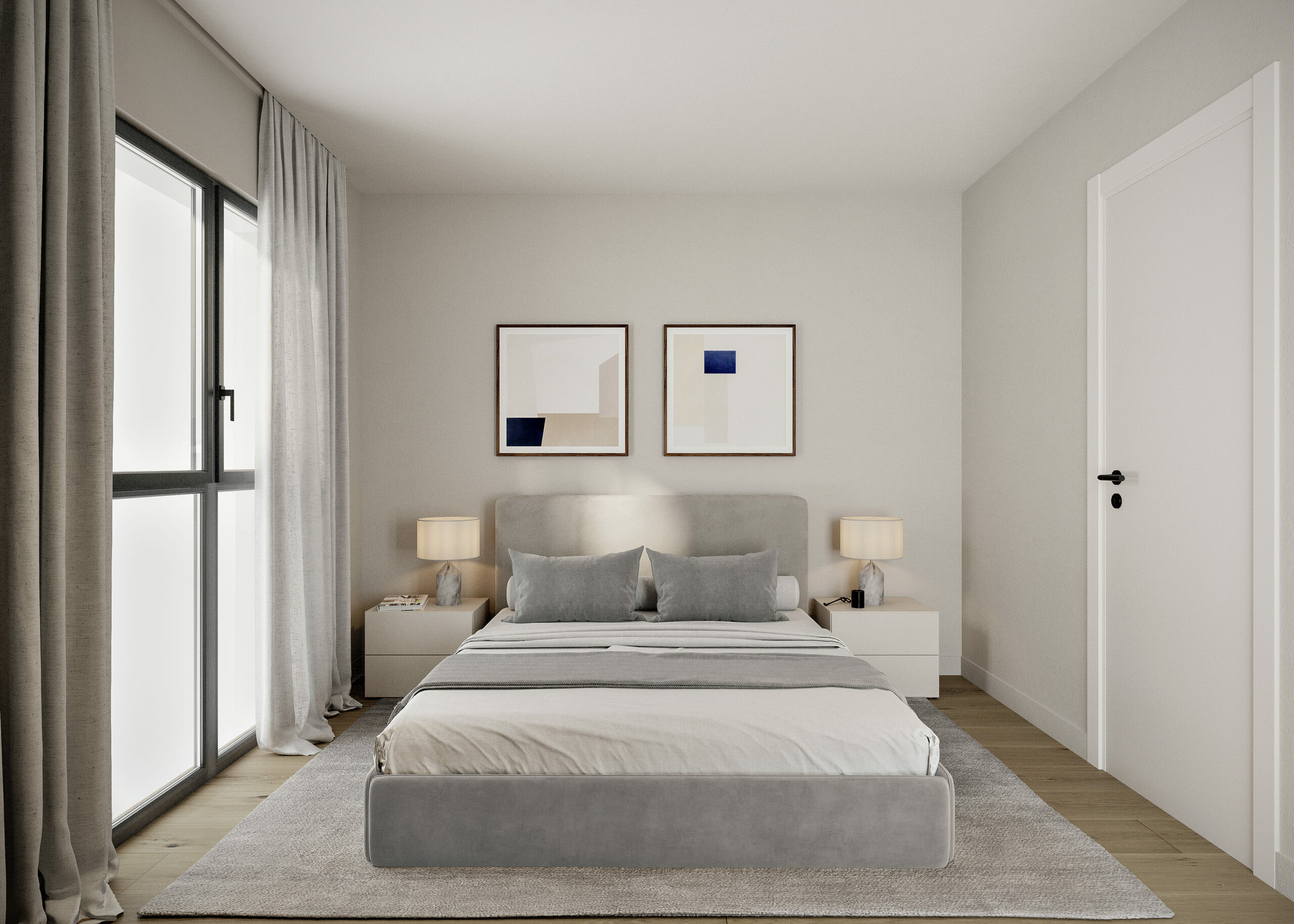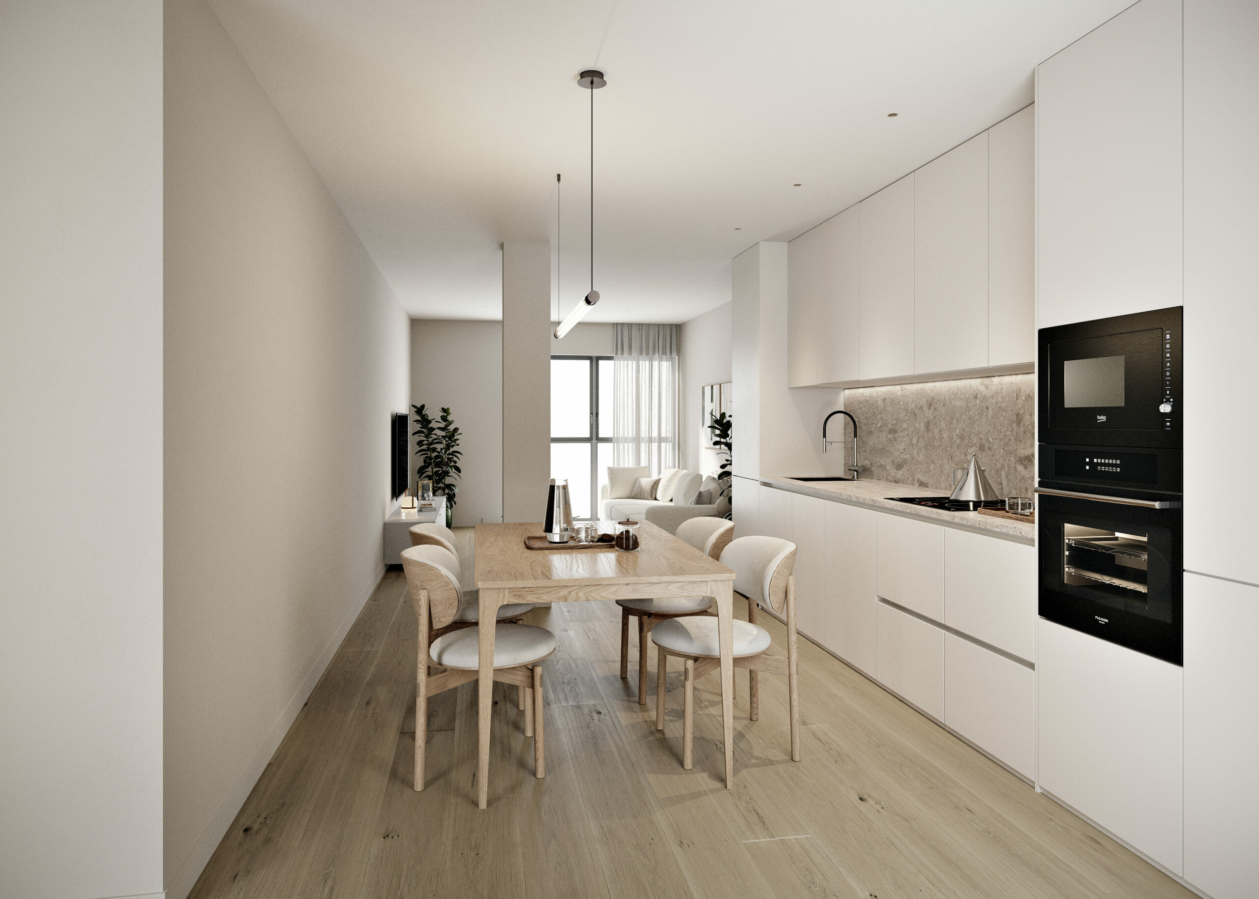 Por otro lado, las viviendas de dos dormitorios están pensadas para una vida familiar o estancias prolongadas, con un dormitorio principal en suite y otro dormitorio doble secundario, ambos bañados por luz natural. La zona común se desarrolla en concepto abierto, con cocina, comedor y salón integrados en una única pieza que favorece la convivencia, la amplitud visual y la conexión con el exterior a través de sus grandes vanos acristalados