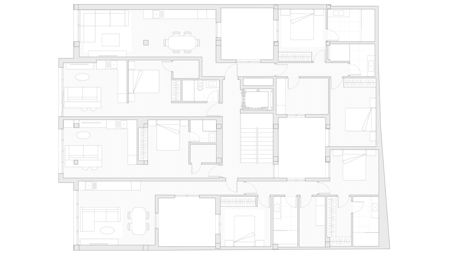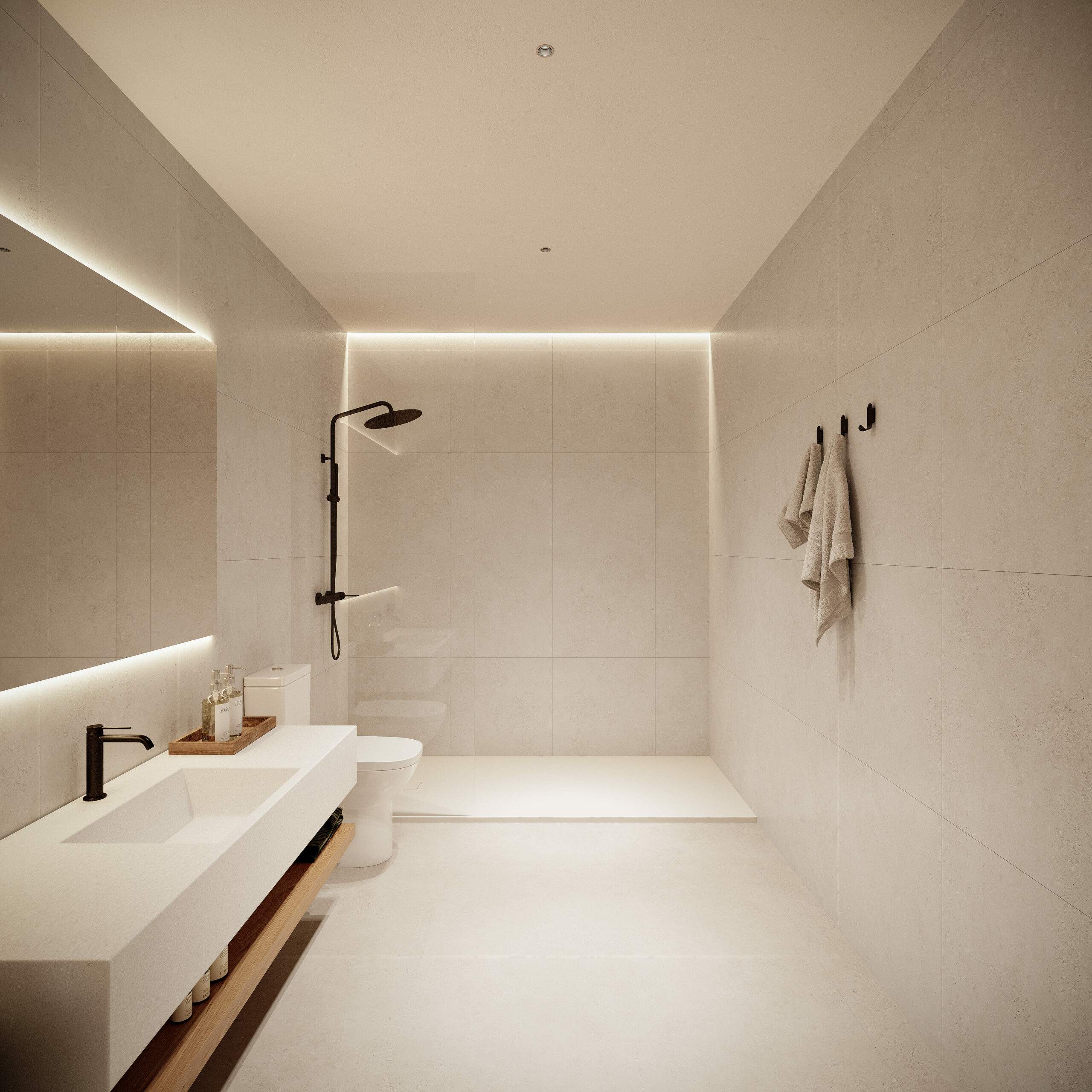 El edificio se organiza en torno a tres generosos patios interiores que, junto con la apertura de grandes ventanales en fachada, garantizan una óptima ventilación cruzada y una iluminación natural excepcional en todas las estancias. Esta estrategia bioclimática no solo mejora el rendimiento energético del conjunto, sino que también crea atmósferas interiores luminosas, tranquilas y en conexión directa con el clima privilegiado de la zona. El diseño cuida especialmente la ergonomía, con baños amplios, zonas de almacenaje eficientes y materiales cálidos que aportan confort sin excesos.