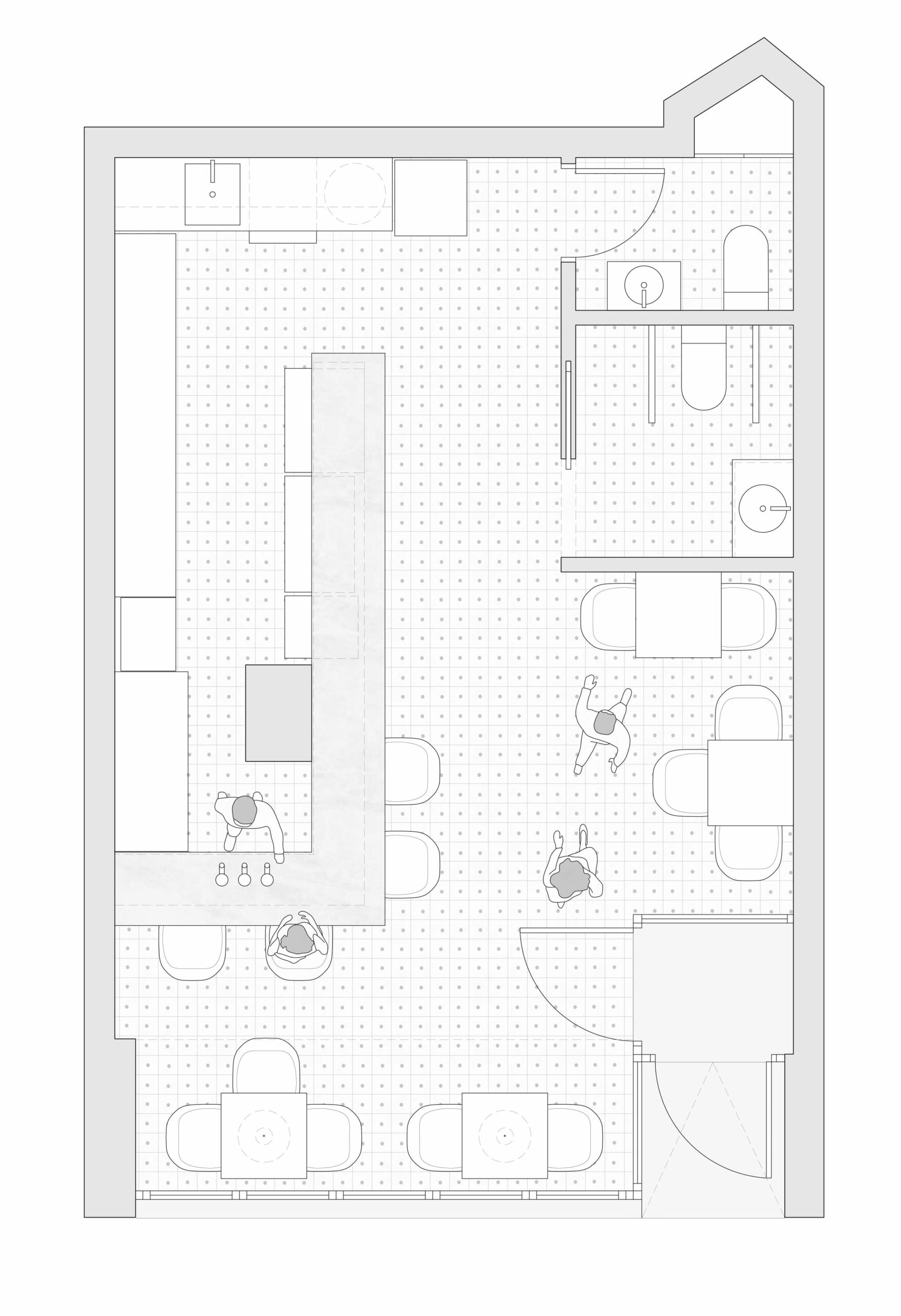 Pese a su reducido tamaño, el local goza de gran altura, por lo que se decide generar un altillo para almacenaje sobre el área de aseos. Asimismo, para contrarrestar la altura del local y evitar un efecto indeseado, se opta por dividir cromáticamente las paredes en una franja inferior blanca y una superior en gris antracita