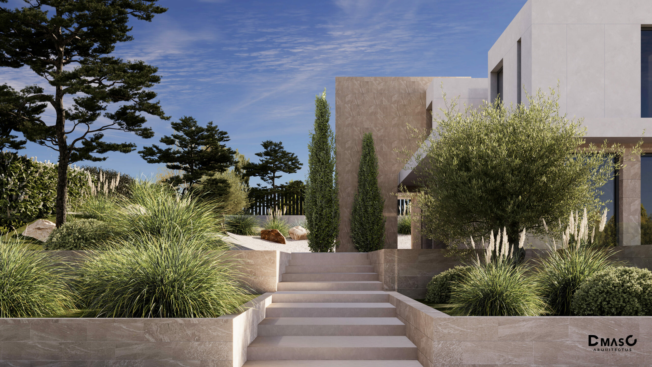Los patios interiores cumplen un papel esencial, introduciendo luz, ventilación y vegetación dentro de la vivienda, reforzando la sensación de bienestar y conexión con el entorno.