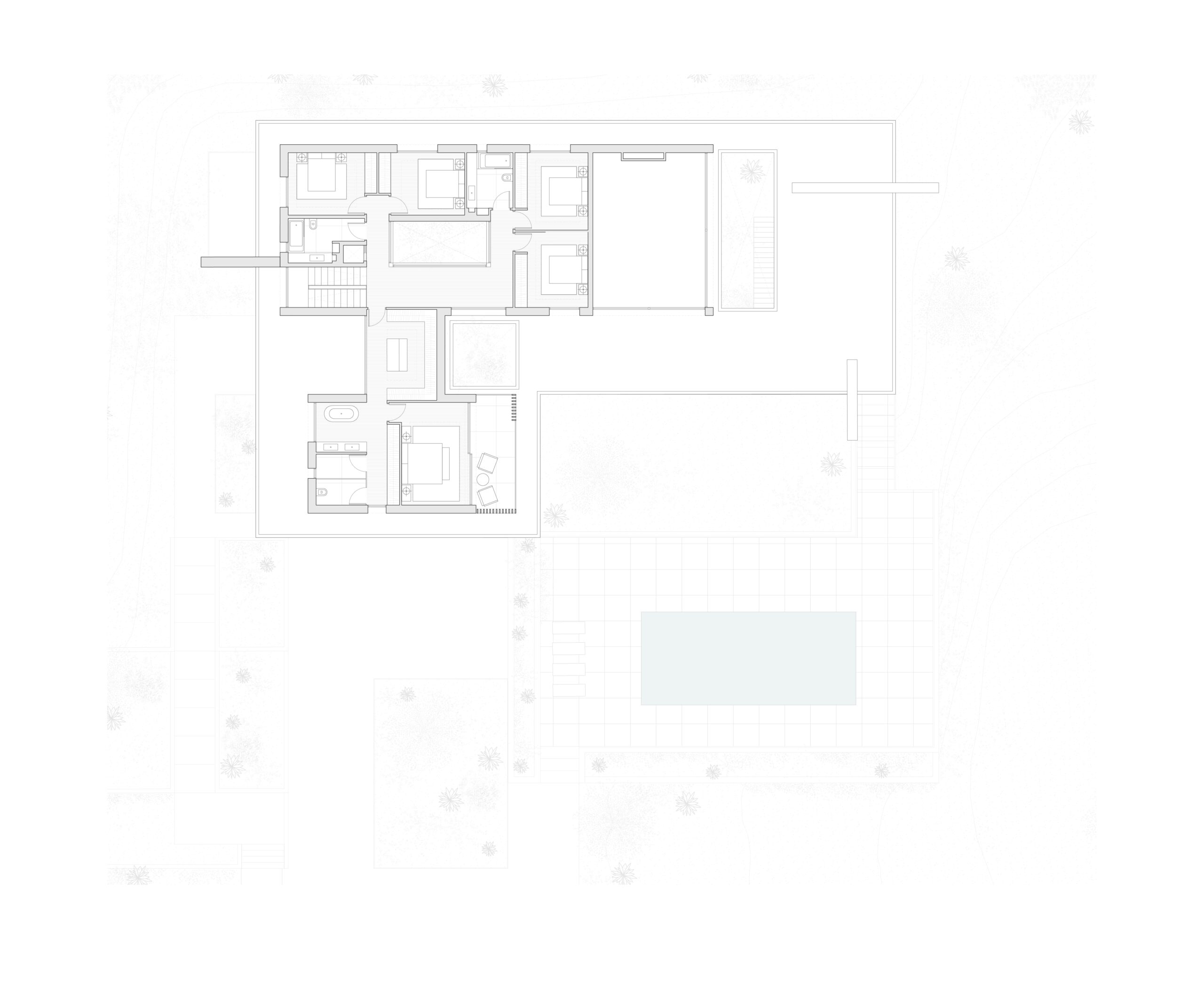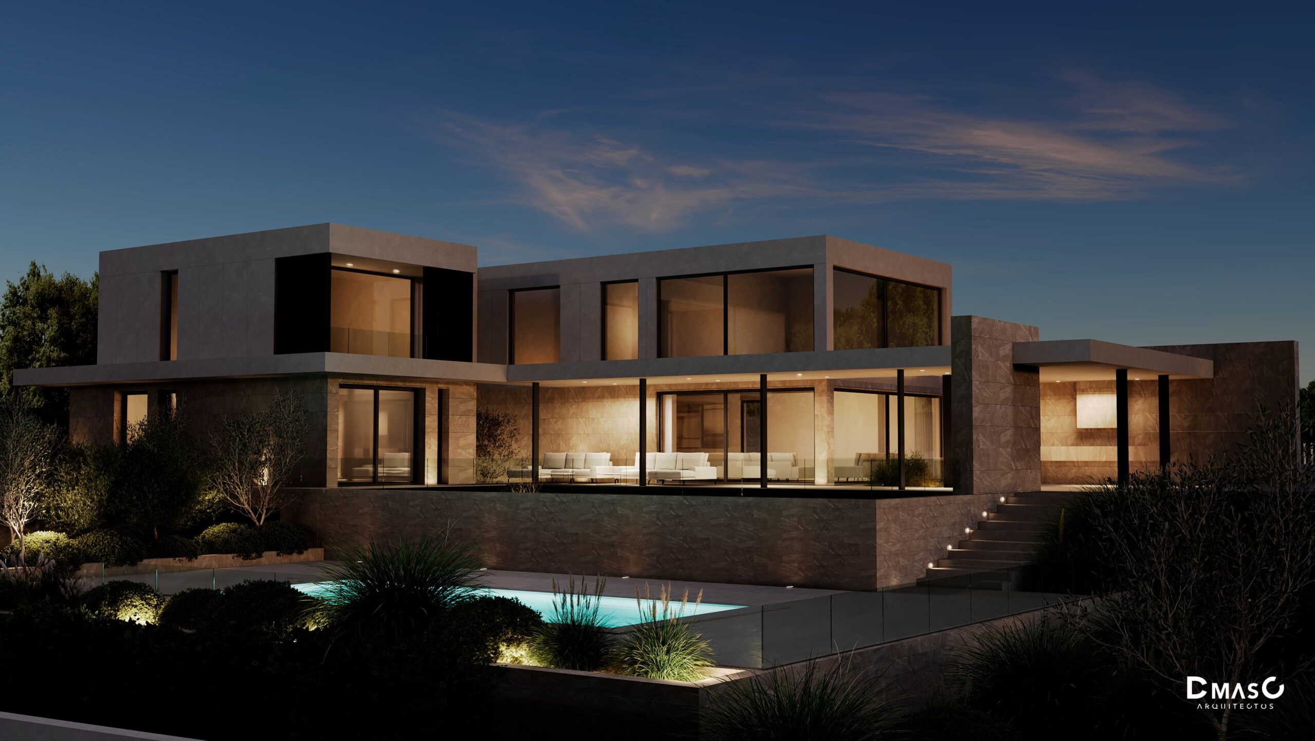 En la planta superior se ubican tres dormitorios adicionales y la suite principal, que dispone de un amplio vestidor y baño privado. Desde esta planta, las vistas se abren hacia el horizonte y la luz que entra por los grandes ventanales genera una atmósfera de serenidad y privacidad. La planta sótano alberga tanto espacios técnicos como espacios de ocio, minuciosamente diseñados para cubrir todas las necesidades y deseos del cliente.