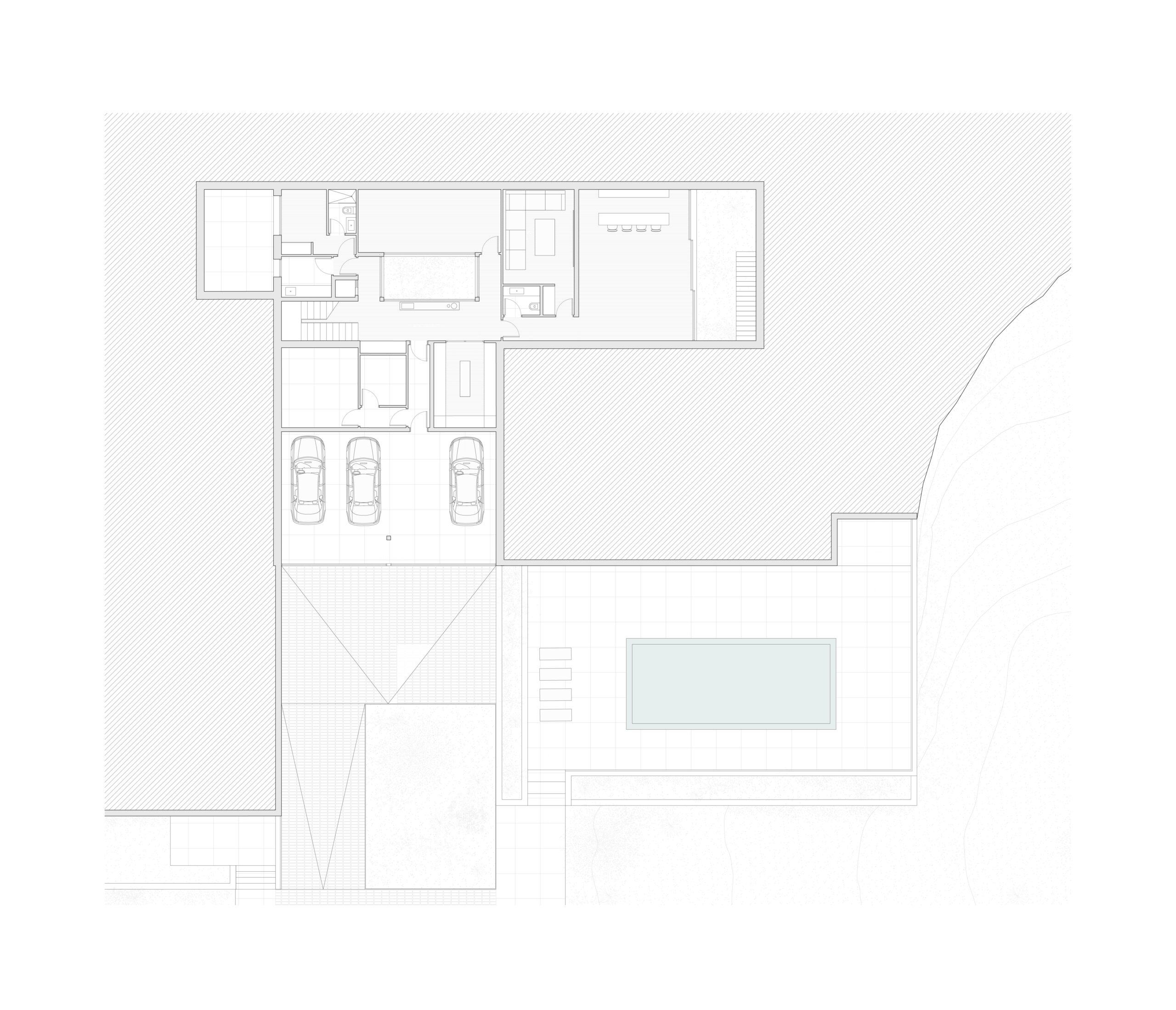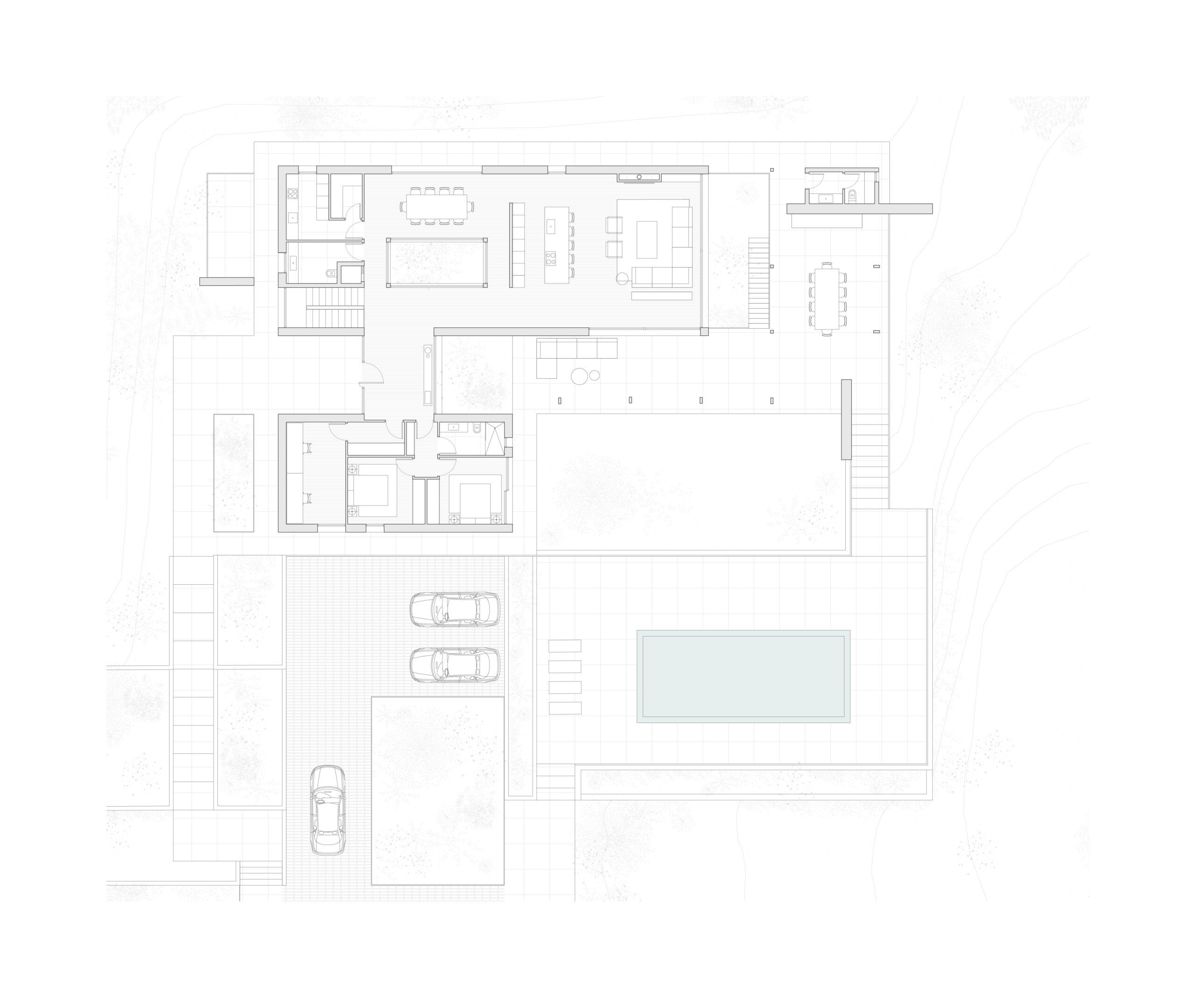 La piscina, situada al borde del terreno, se proyecta en una plataforma desde la que se puede acceder a la entrada y garaje como a la zona de salón cocina. Este gesto no solo aporta dinamismo al conjunto, sino que se adapta y enfatiza la naturalidad del entorno.